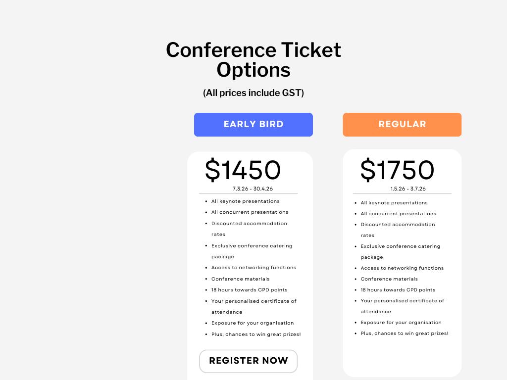 · Notification of acceptance will be sent via email to the submitting author by 20 February 2026. Acceptance or otherwise is at the discretion of the committee whose decision is final. All presenting authors must register and pay to attend the Conference. If presenting author registration isn’t completed by the due date, then the presentation may be removed from the program.